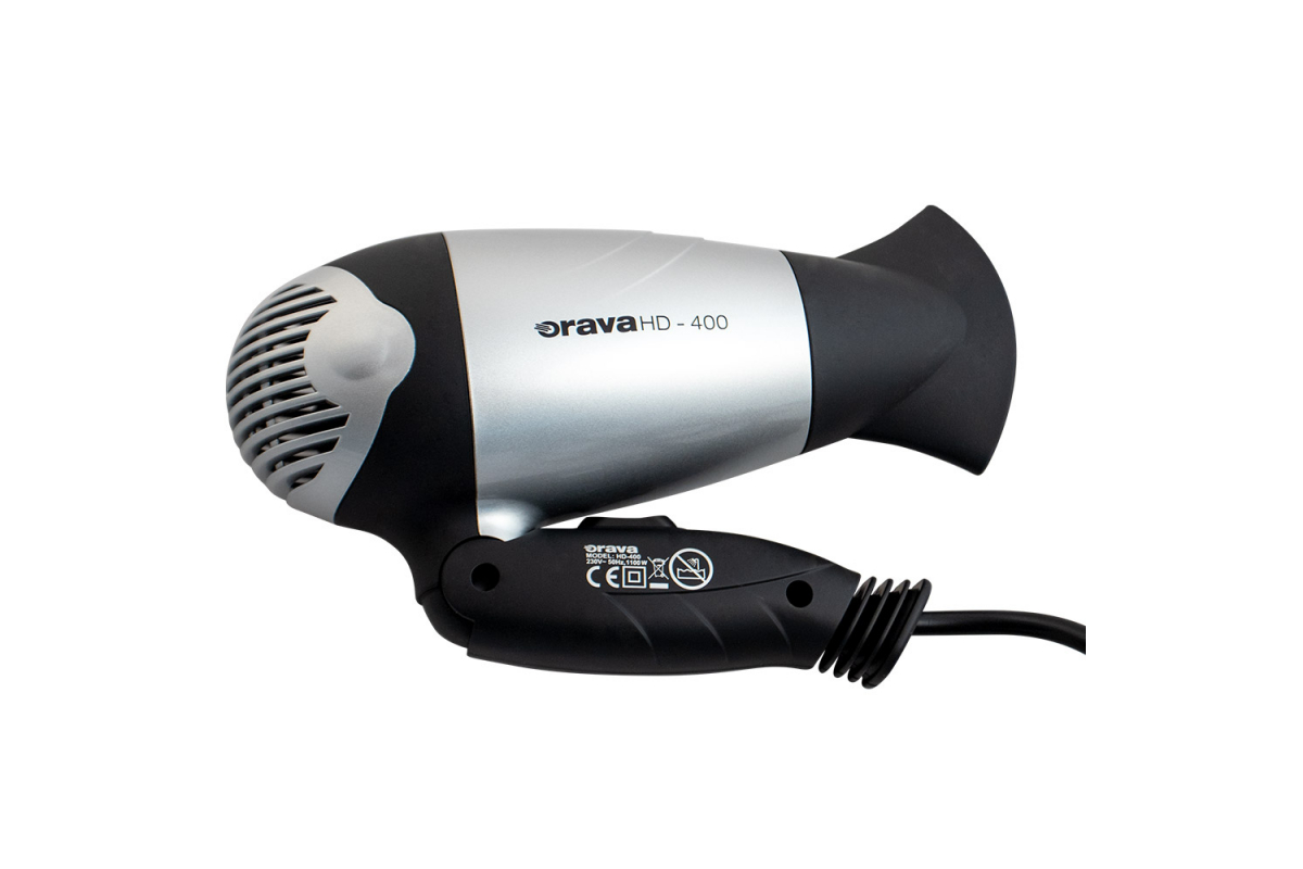 For any trip, pack a small but handy Orava HD-400 with a foldable handle. The hair dryer can be set to 2 power levels and its grid is made of ceramic material for even heat concentration and protection against hair damage during drying.